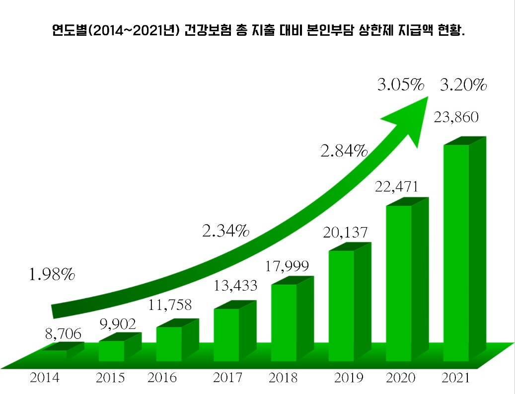 2021년도 본인부담상한제 적용 대상자는 2020년 대비 8만 9188명(5.4%) 늘었고, 지급액은 2020년 대비 1389억 원(6.2%) 증가한 것으로 나타났습니다.