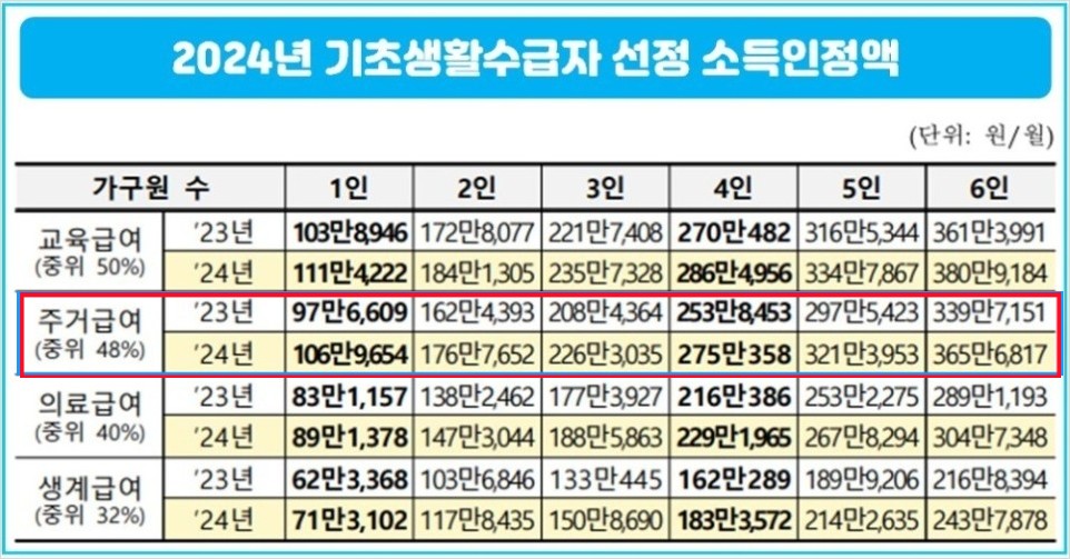 지원 대상은 소득 인정액이 기준 중위소득 48% 이내의 가구입니다.2022년에는 기준 중위소득의 46% 이하였고 2023년에는 47%였다가 24년 올해는 신청 자격이 48%로 확대되어 지원을 해준다고 합니다.1% 정도씩 확대가 되고 있어서 크게 느껴질 정도로 체감은 어렵지만 앞으로 50%까지 인상을 시킬 예정이라고 하니까 혜택을 받을 기준이 아니더라도 매년 한 번씩은 확인을 해보시는 것이 좋을 것 같습니다.기준 중위소득은 매년 정부에서 결정을 하게 되는데 작년 23년도보다 올해에는 기준 중위소득이 인상이 되어서 주거급여로 받을 수 있는 금액이 월 최대 2만 7천 원 인상이 되었습니다.신청 자격이 되는 기준 중위소득의 48%의 금액은 1인 가구 106만 9 654원, 2인 가구 176만 7,652원, 3인 가구 226만 3035원, 4인 가구 275만 358원, 5인 가구 321만 3953원, 6인 가구 365만 6,817원입니다. 가구 원 수와 거주 지역에 따라서 각각 다르게 지원이 되고 있는데 서울은 1급지, 경기 인천이 2급지, 광역 세종시 수도권에 특례시가 3급지 그 외 지역이 4급지로 분류가 되어 있습니다.