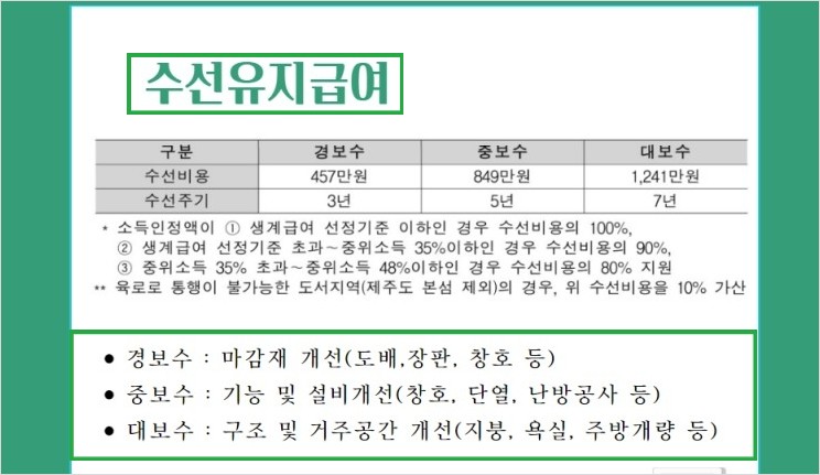 광역시에 살고 있는 1인 가구를 예를 들면 21만 6천 원까지 지원된다고 했는데 실제로는 16만 원 월세를 산다 그러면 16만 원만 지원이 되는 것입니다.자가의 경우에는 주택의 노후도에 따라서 도배와 난방, 지붕 등의 수비를 위한 금액을 지원해 주게 되는데 경보수 3년을 주기로 수선 비용 457만 원, 중보수는 5년 주기로 849만 원, 대보수는 7년 주기로 1241만 원을 지원해 주게 됩니다.